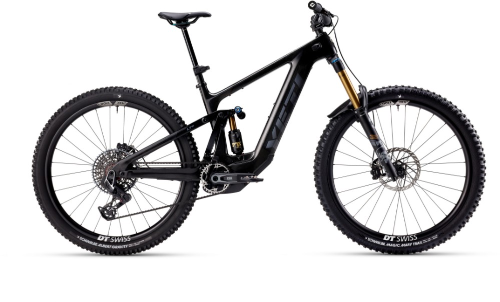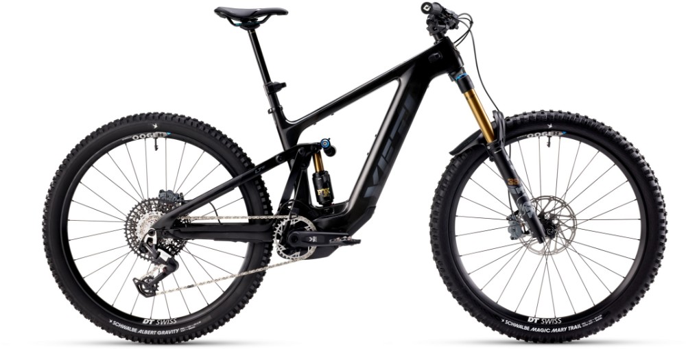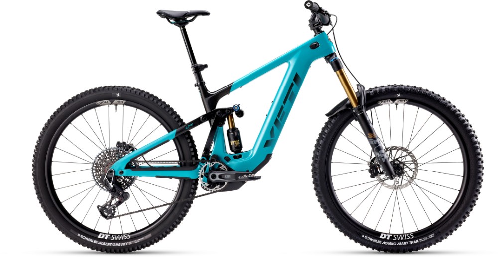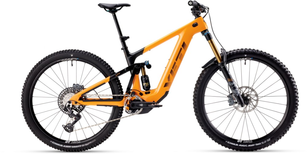yeti ebike on descent over log